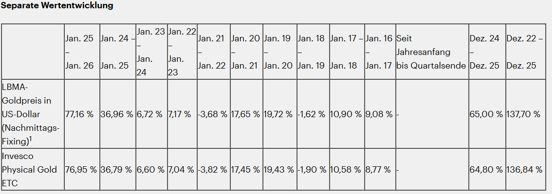 Nachstehend aufgeführt wird die vergangene Wertentwicklung des Invesco Physical Gold ETC und des LBMA-Goldpreises (der Referenzindex), beide in US-Dollar und zum 31. Dezember 2025. Wechselkursschwankungen können dazu führen, dass die Renditen steigen oder fallen.