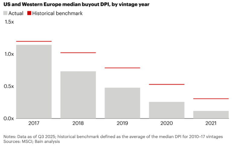 Management fees are under pressure, while investors who committed capital during peak years such as 2021 and 2022 face constraints as distributions remain weak. Bain notes that general partners will need to improve value creation materially, although evidence of such improvement remains limited.