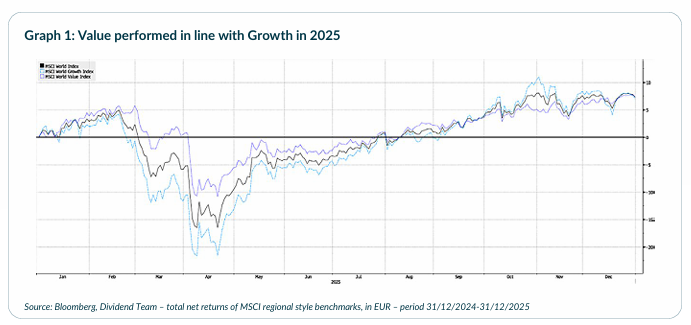 Now, the narrative has become more complicated. Despite the strong performance of growth stocks following last April’s tariff shocks, value has been quietly resilient. Over the course of 2025 as a whole, the MSCI World Value Index performed in line with its growth counterpart; a consequence of it holding up much better during the selloff at the start of the year.