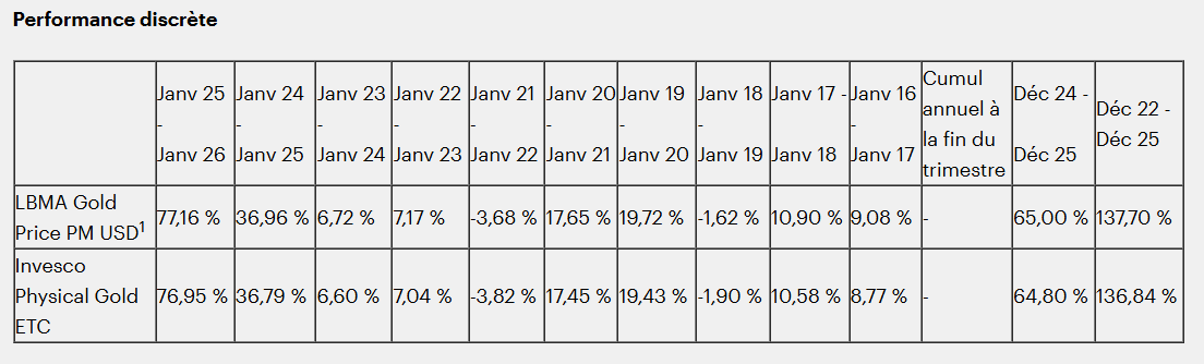 Les tableaux suivants montrent les performances passées de l’ETC Invesco Physical Gold et du LBMA Gold Price (l’indice de référence), tous deux en USD, jusqu’au 31 décembre 2025. Les rendements peuvent varier à la hausse et à la baisse en fonction des fluctuations des cours de change.