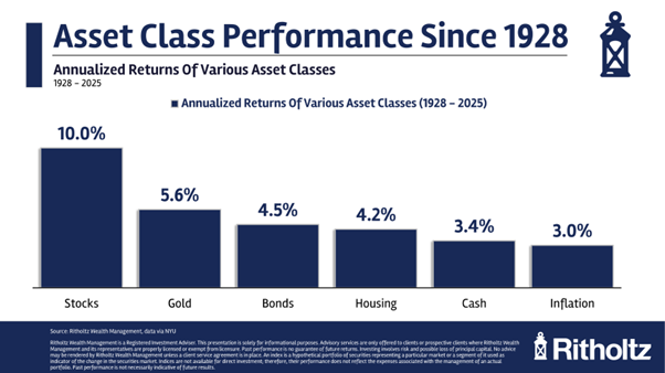 Neem onderstaande grafiek van Ben Carlson van Ritholtz Wealth Management, die de gemiddelde jaarrendementen weergeeft van een aantal grote beleggingscategorieën sinds 1928.