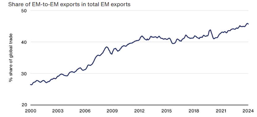 Het aandeel van de export van groeilanden dat naar andere opkomende markten gaat, is in twintig jaar gestegen van ongeveer een kwart naar meer dan 45 procent. Ook de handel in diensten weerspiegelt die versterkte onderlinge verwevenheid.