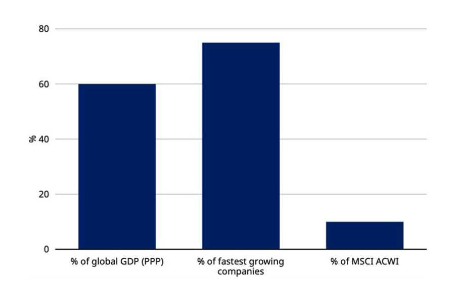 Groeilanden vertegenwoordigen bijna 60 procent van het wereldwijde bbp en huisvesten sommige van de sterkst groeiende bedrijven. Maar ze maken wel slechts 10 procent uit van de MSCI ACWI.