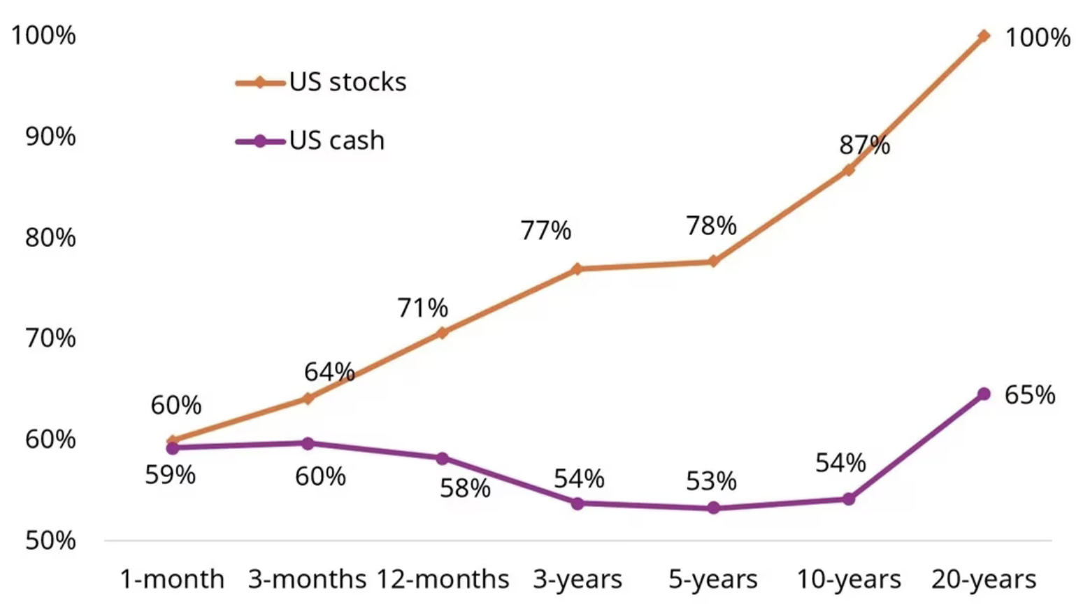 En precies dáár scoren aandelen historisch beter dan schijnbaar veilige keuzes zoals cash. Op de korte termijn kloppen aandelen én cash inflatie ongeveer even vaak, rond 60% van de tijd, (en mislukken dus ook circa 40% van de tijd). Maar naarmate de beleggingshorizon langer wordt, stijgt de kans dat aandelen inflatie verslaan, terwijl die kans voor cash laag blijft. Vanuit dat perspectief is cash op de lange termijn juist risicovoller: de kans dat de koopkracht achterblijft is groter dan bij aandelen.