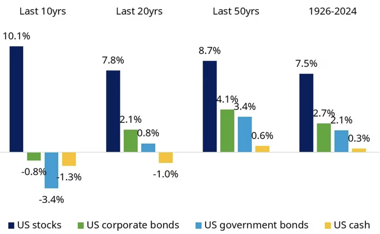 Afbeelding: Rendementen van Amerikaanse beleggingscategorieën boven inflatie, 1926–2024.