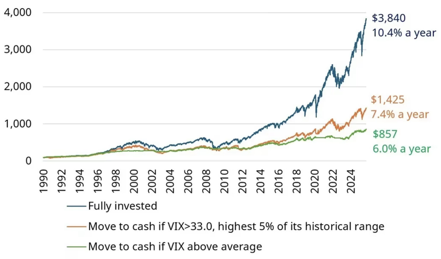 Afbeelding: Groei van $100 bij volledig in aandelen belegd blijven, versus vluchten naar cash wanneer de VIX hoog staat.
