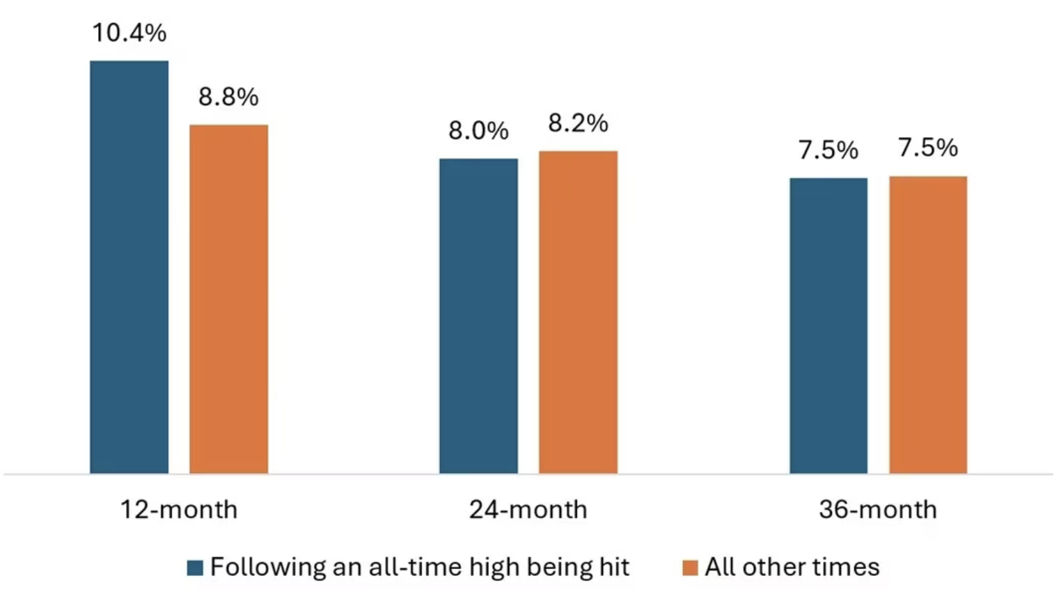 Uit Lamont’s analyse van aandelenrendementen sinds 1926 volgt een ondubbelzinnig antwoord: nee. Gemiddeld zijn de 12-maandsrendementen ná het aantikken van een all-time high beter dan op andere momenten: +10,4% reëel tegenover +8,8% wanneer de markt níét op een record stond. Over twee of drie jaar bezien zijn de resultaten vergelijkbaar, ongeacht of de markt op een all-time high stond of niet.
