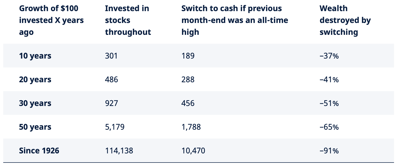 Afbeelding: Wie verkoopt zodra de markt op een all-time high staat, vernietigt op lange termijn significant vermogen