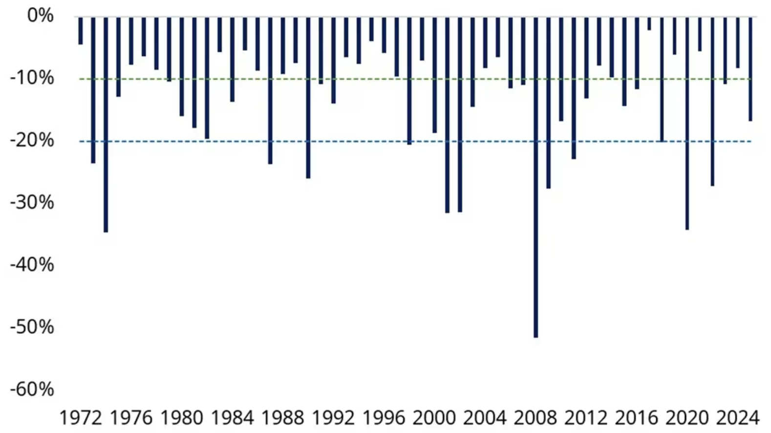 De volatiliteit van dit jaar voelt heftig, maar in historisch perspectief is hij niet uitzonderlijk. In 31 van de afgelopen 54 jaren (inclusief 2025) daalde de markt ergens in het jaar met 10% of meer. In 13 van die jaren liep de daling zelfs op tot 20% of meer. Met andere woorden: stevige correcties horen bij beleggen.